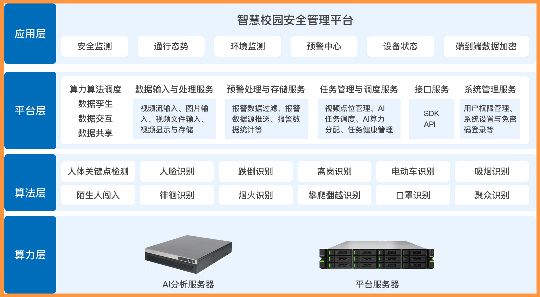 AI分析決策層: 基于強大的人工智能算法(計算機視覺CV、行為分析、模式識別、大數據分析等),系統能:
